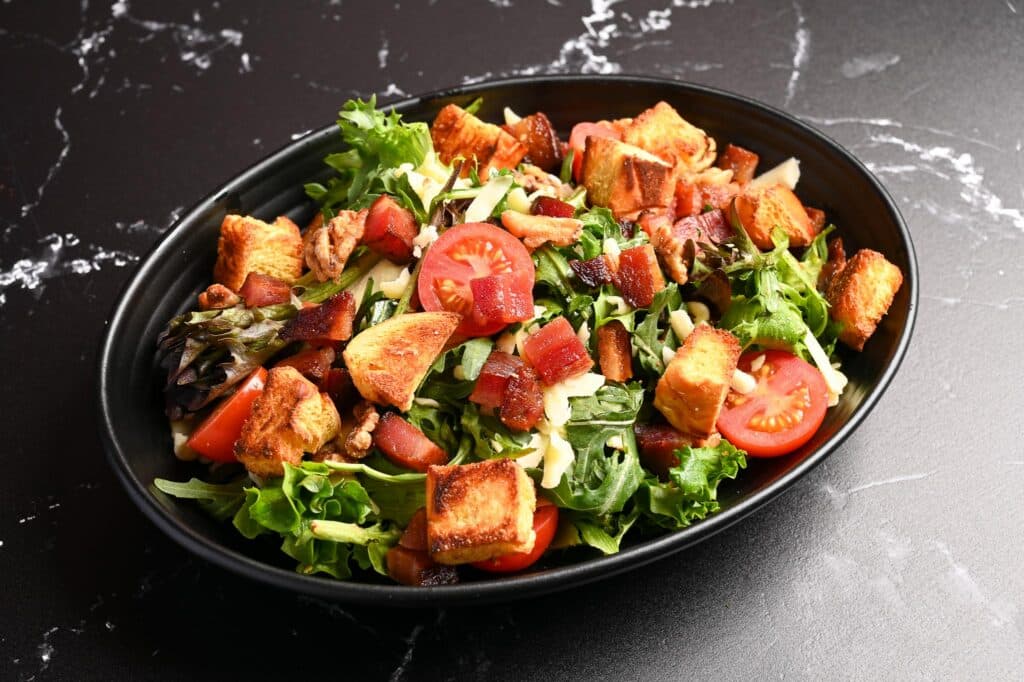 Spring mix, thick-cut bacon, candied walnuts, challah bread croutons, cherry tomatoes and shredded mozzarella tossed honey vinaigrette dressing